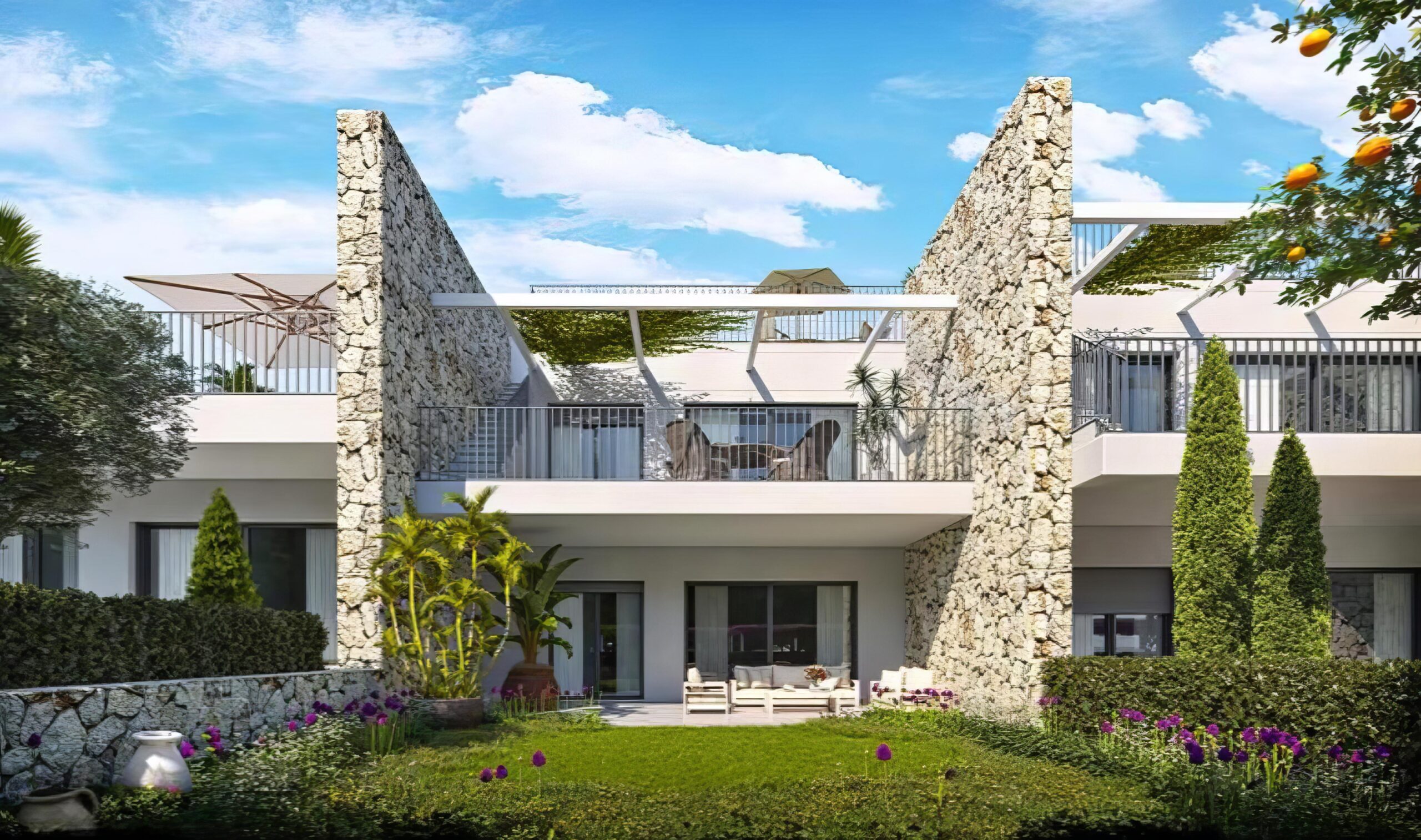 The ground-floor apartments feature large terraces with covered verandas and private gardens, perfect for family life or peaceful moments in the sun.