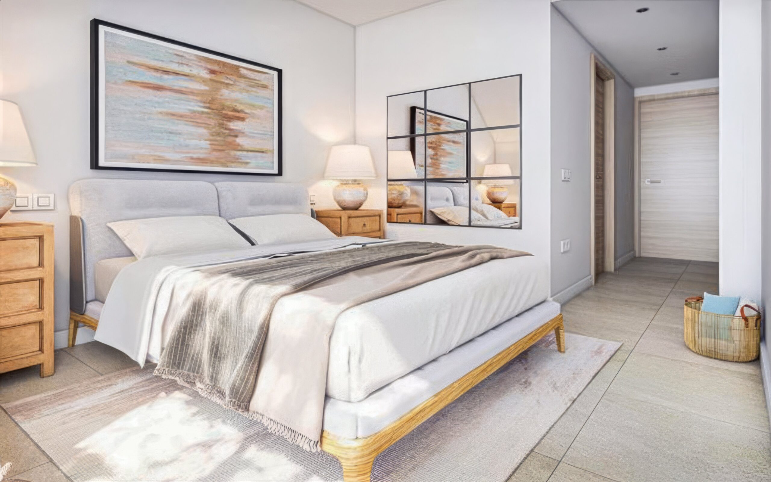The master suite has its own bathroom and direct access to the terrace, while the two other bedrooms share a stylish bathroom with exclusive materials and fixtures from Tres. All rooms are equipped with built-in wardrobes and discreet lighting, which supports the calm atmosphere.