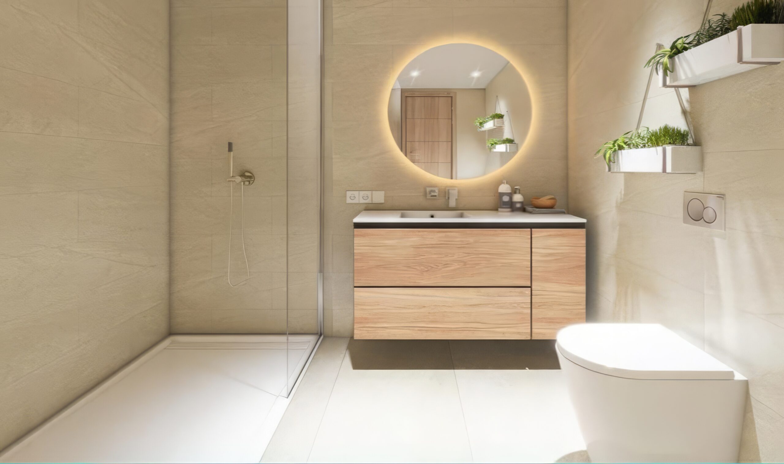 Bathrooms with natural wood details and underfloor heating