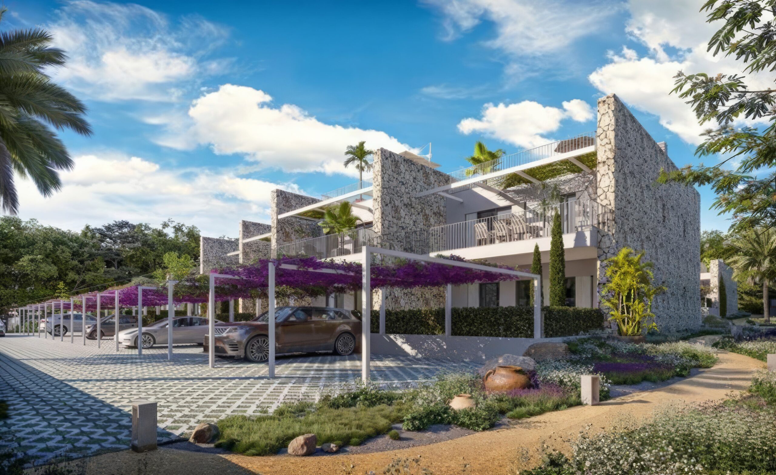 The ground-floor apartments feature private gardens and large covered terraces with space for both lounging and outdoor dining – an ideal setting for morning coffee, quiet afternoons, or dinners under the open sky.