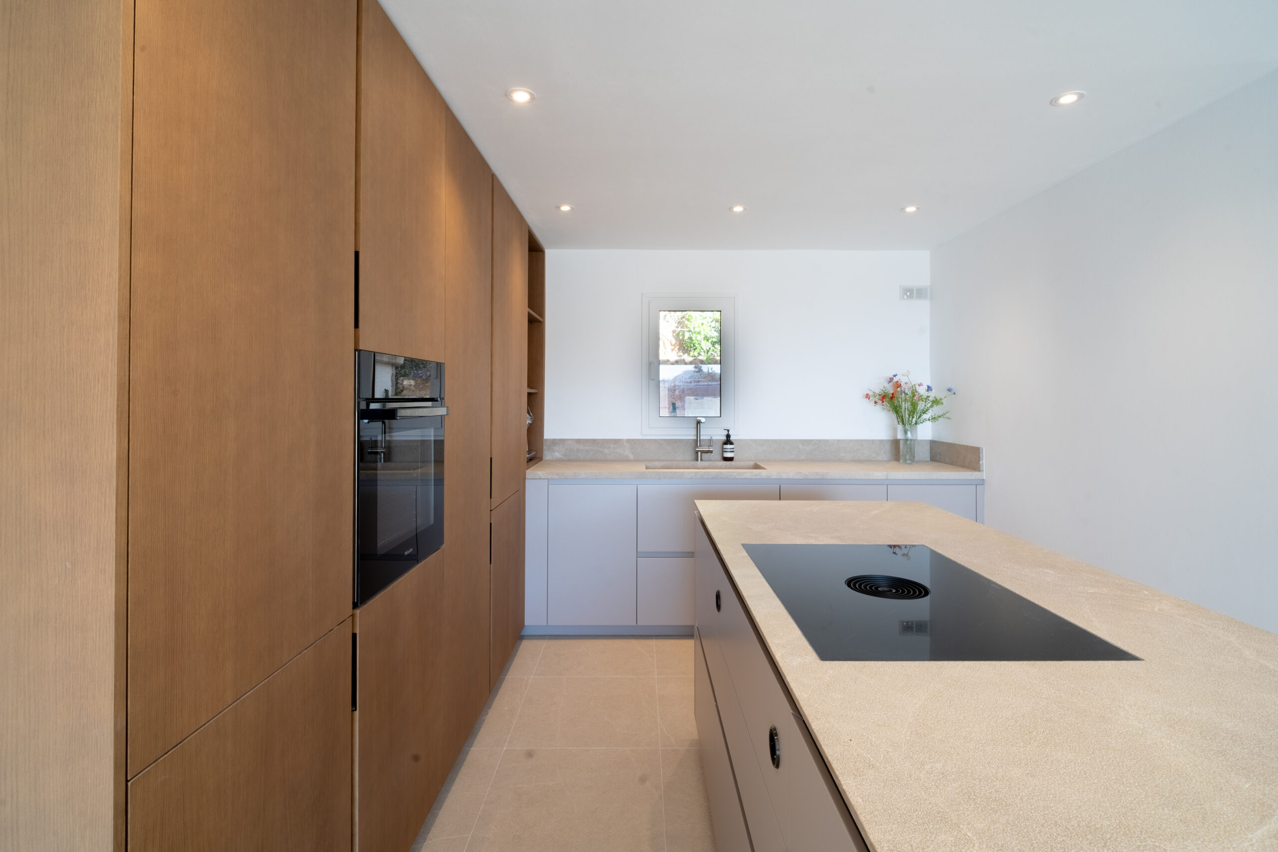 Køkken og opholdsrum er indrettet som ét samlet samlingspunkt, hvor funktionalitet og design smelter sammen. Her er der skabt plads til både hverdag og samvær – fra madlavning til lange middage og afslappede stunder.